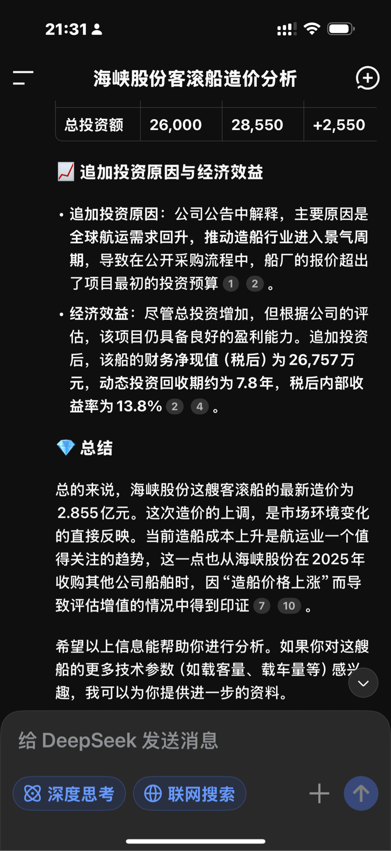 $海峡股份(SZ002320)$ 两艘船造价约5.6亿
