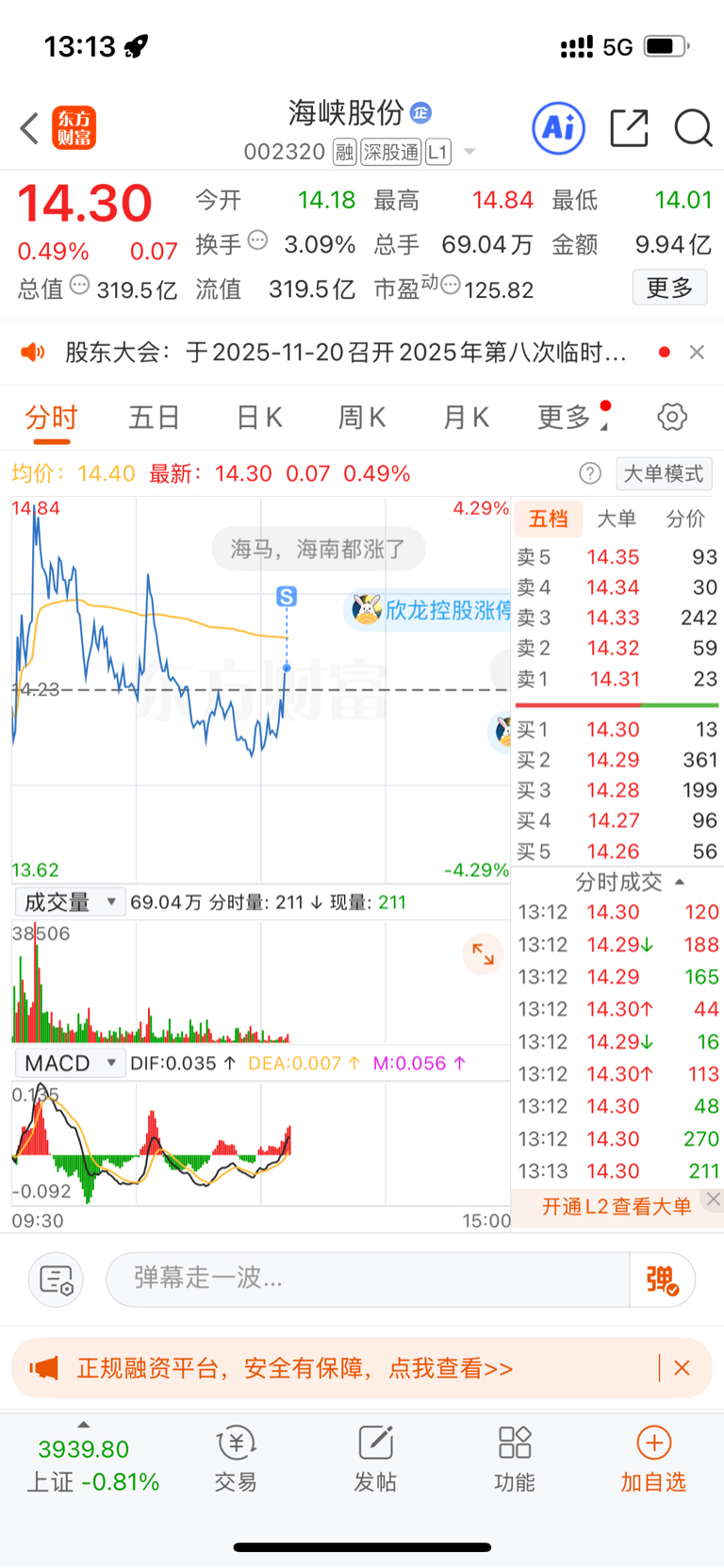 $海峡股份(SZ002320)$