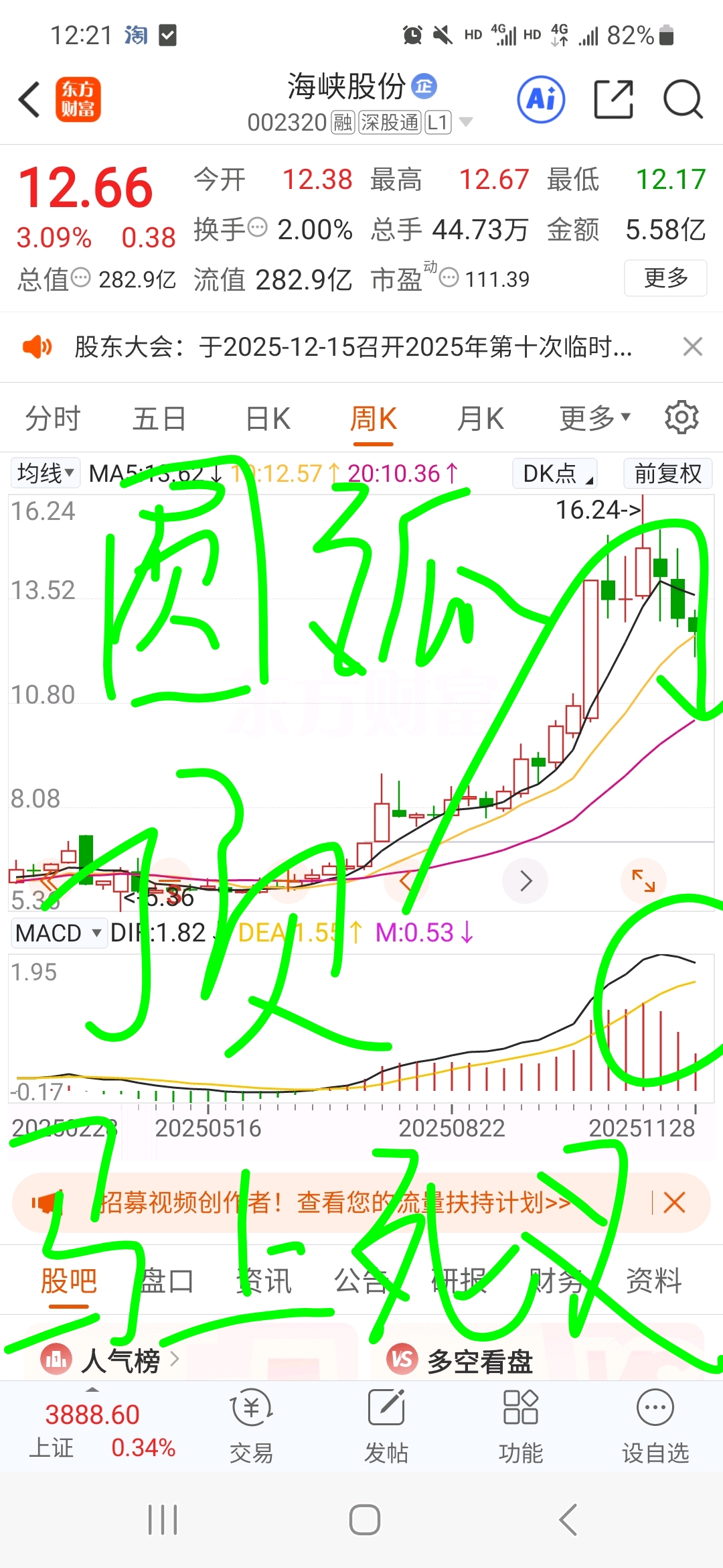 $海峡股份(SZ002320)$ 周线圆弧顶,马上死叉