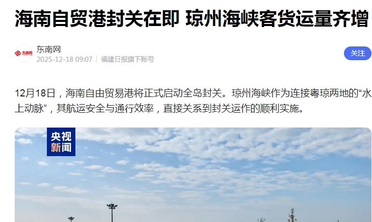 海南自贸港封关在即,琼州海峡客货运量齐增,据预测,2026年春运期间,琼州海峡的