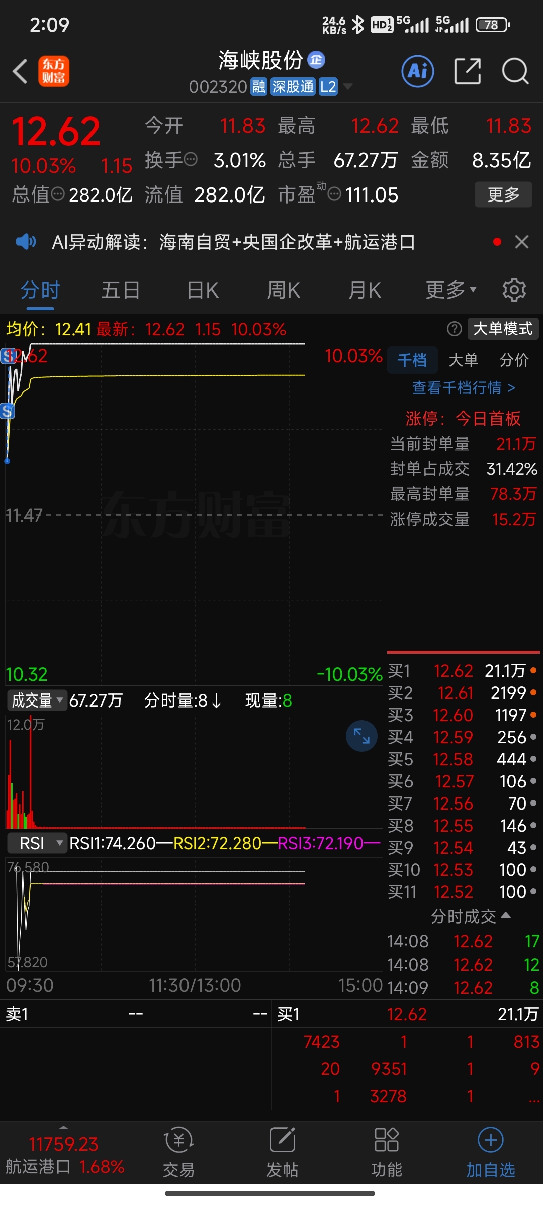 $海峡股份(SZ002320)$ 开盘出了