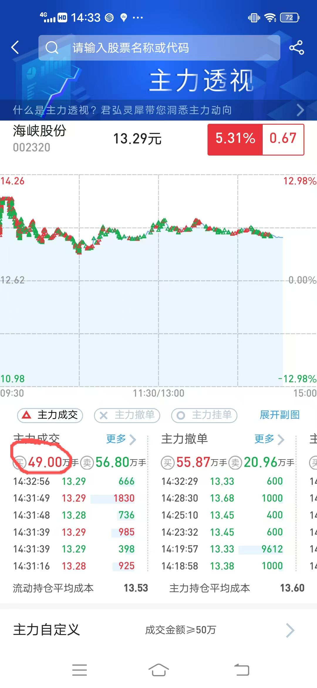 大事不妙主力今天把散户耍了,主力买入49万手总买入111.65万手,也就是说散户高出接盘来62.65万手,主力潇洒的离场了。我们成了接盘侠!13-14元之间又增加了几十万手的散户接盘侠