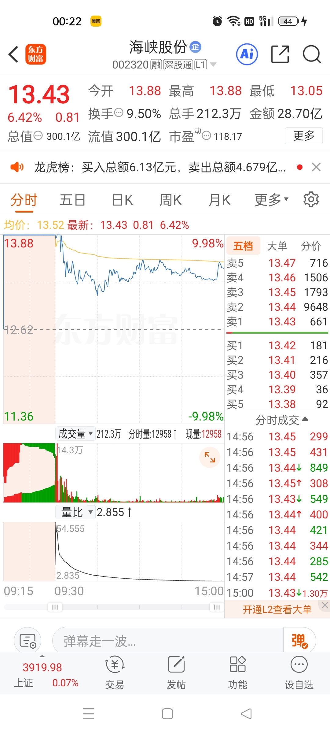 $海峡股份(SZ002320)$ 竞价合适,放量关键只上板一次,明天抄底不知道行不行