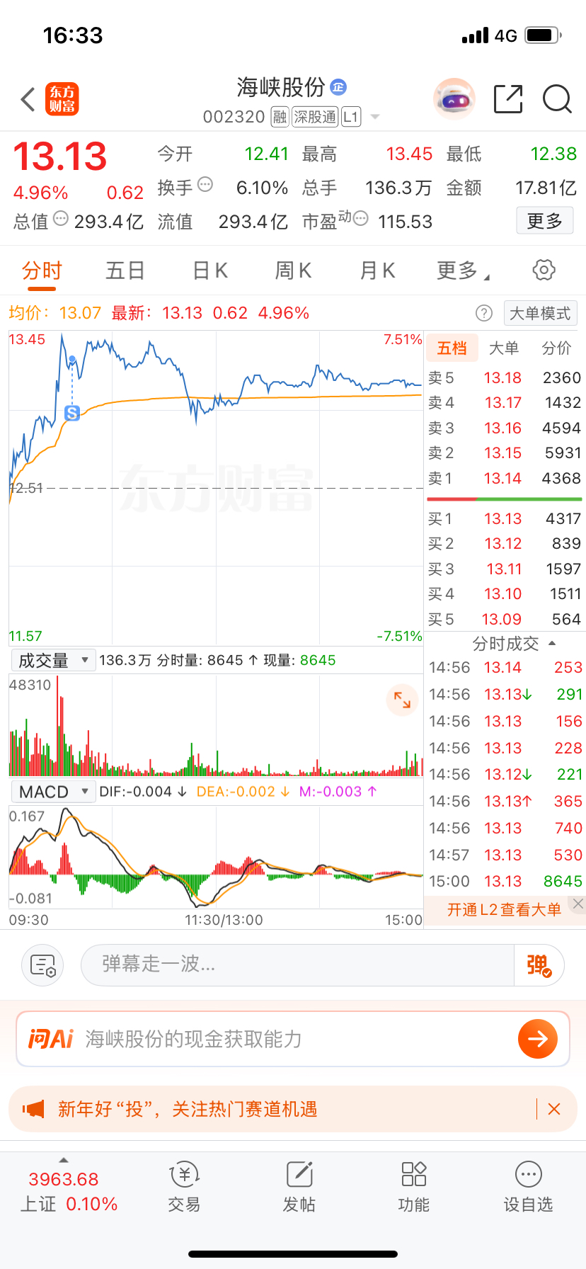 $海峡股份(SZ002320)$ 昨天百大止盈,挑一只海南股进来蹲,又猜对了