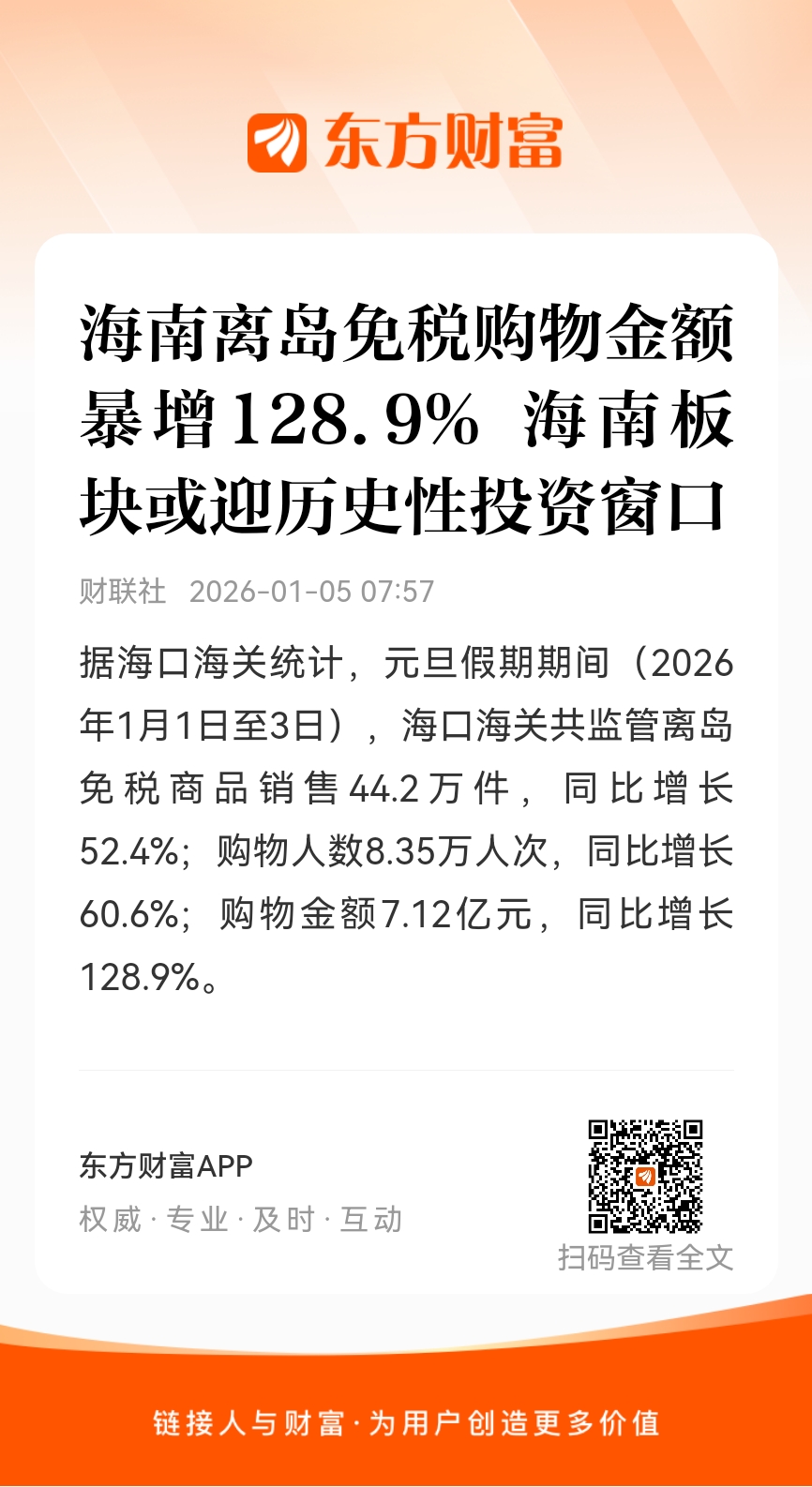 据海口海关统计,元旦假期期间(2026年1月1日至3日),海口海关共监管离岛免税商品销售44.2万件,同比增长52.4%;购物人数8.35万人次,同比增长60.6%;购物金额7.12亿元,同比增长128.9%。