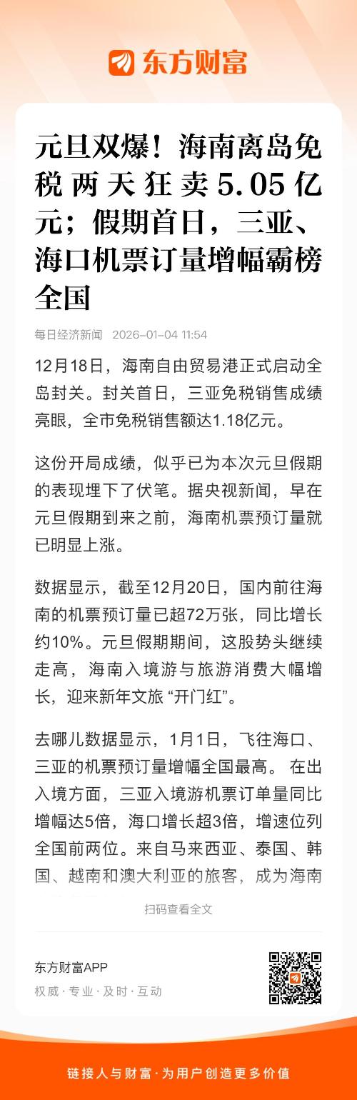 这份开局成绩,似乎已为本次元旦假期的表现埋下了伏笔。据央视新闻,早在元旦假期到来之前,海南机票预订量就已明显上涨。