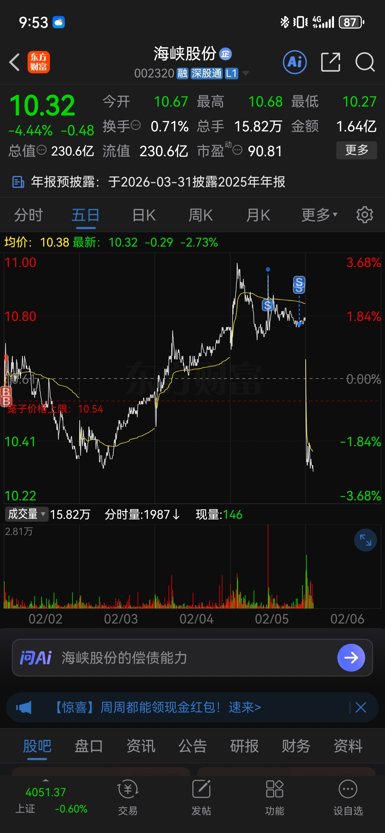 $海峡股份(SZ002320)$ 昨天就说了放量滞涨,有多少人听了,我昨天尾盘获利清仓了