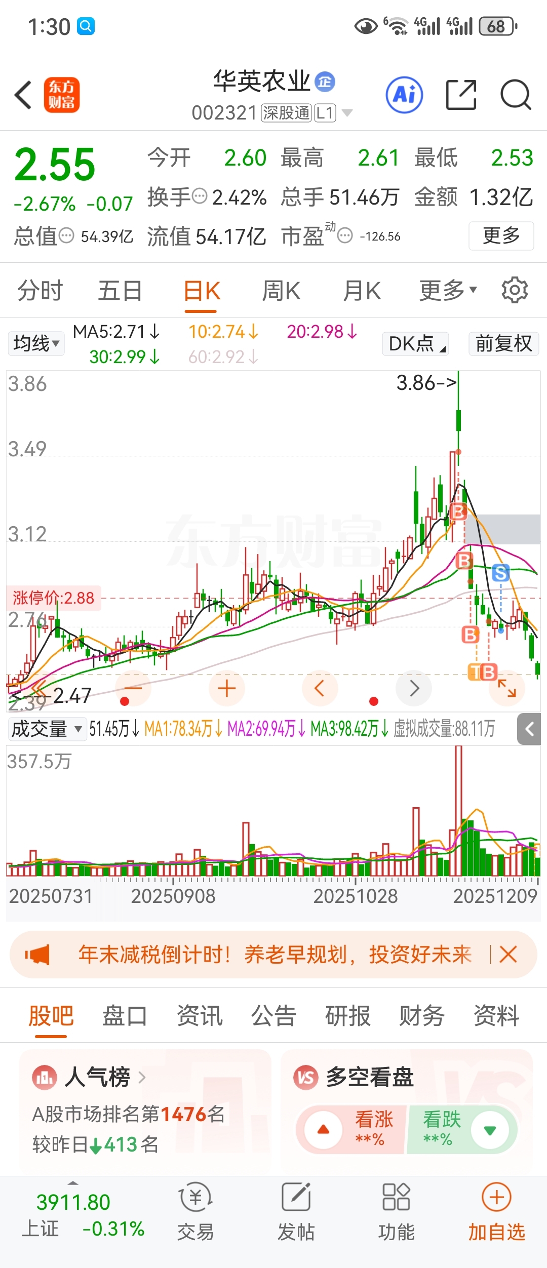 $华英农业(SZ002321)$ 等我回来收拾你