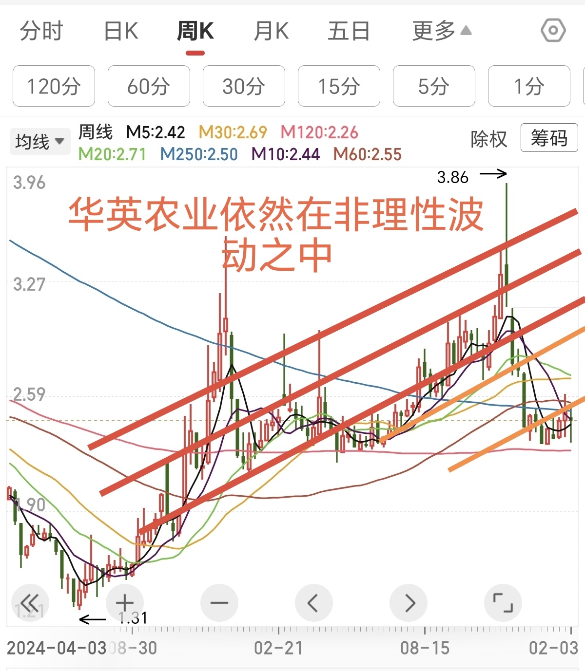 华英农业是亏损股所以非理性波动非常大,华英农业第一目标价位5.75 波动上沿6.1 波动下沿5.35 但是现在讨论第一目标价位并没有意义,自去年11月底跌破正常上升趋势线下沿之后至今没有回补,日线级别上方留了两个跳空缺口,大家都知道跳空缺口是一个反转的标志,这里可以理解为主力跑了,再一个佐证就是成交量!周线上看,3.86这一周放了天量!现在就看上方的缺口什么时候回补,不回补走势就一直为非理性波动,趋势就会一直不明朗。
