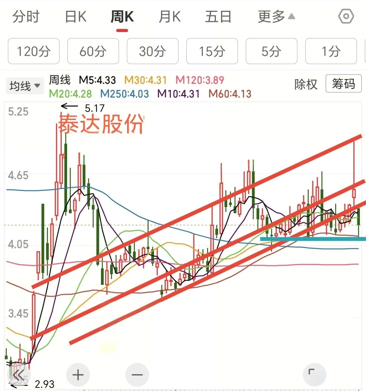 泰达股份第一目标价位7.35 波动上沿7.7 波动下沿6.9 近期最高4.92的回落就是触及到了前高5.17的波动区间,这里阻力极强叠加大盘这两天情绪不好,所以有一定的非理性波动,大家观察一下下方的支撑线是否有效(三天不破)确认有效就耐心等待股价重回上升趋势线即可。
