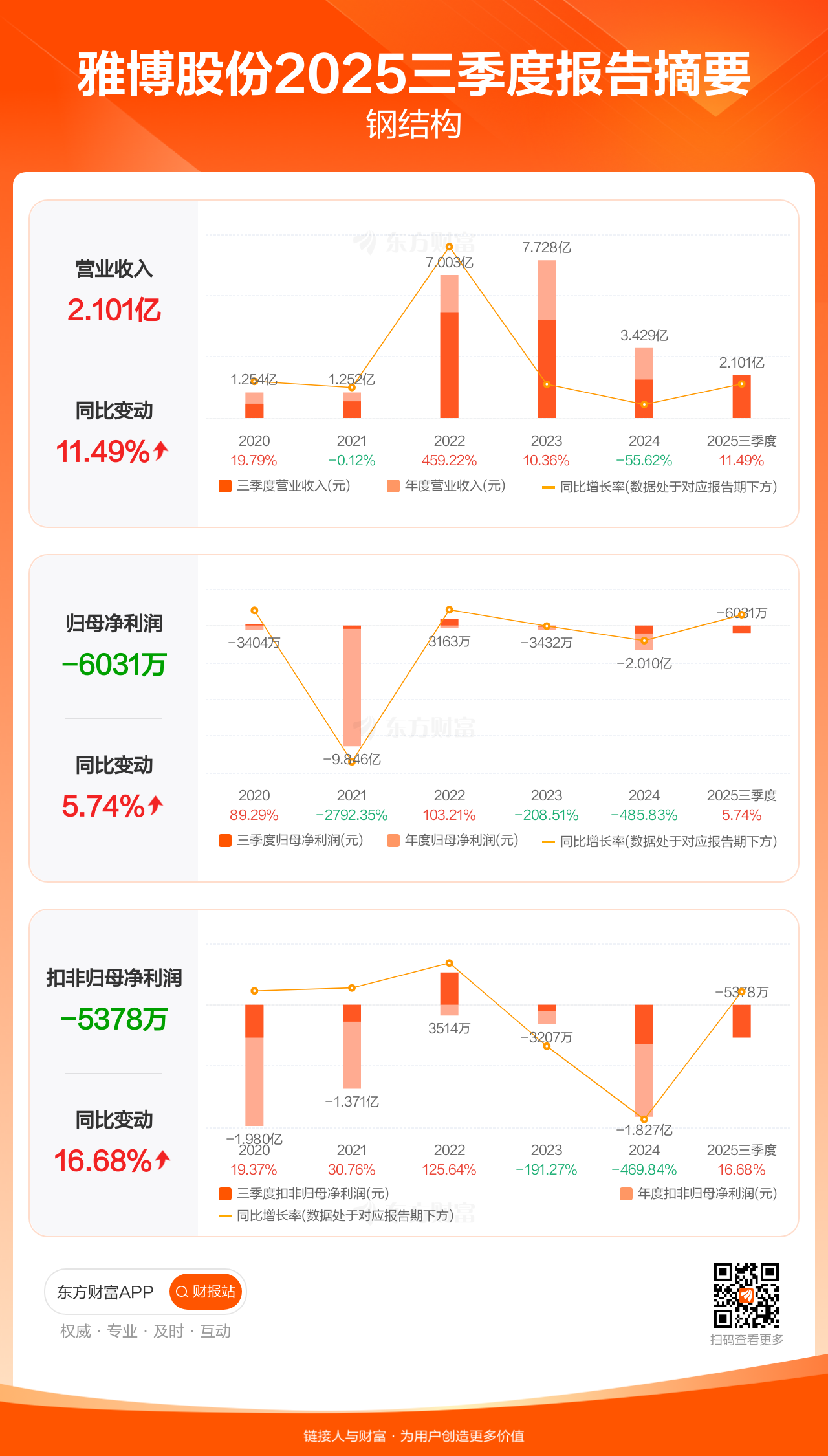 雅博股份10月31日发布2025年三季报显示,公司前三季实现营业收入2.10亿元,同比增长11.49%;归母净利润-6031.41万元;扣非归母净利润-5378.35万元。