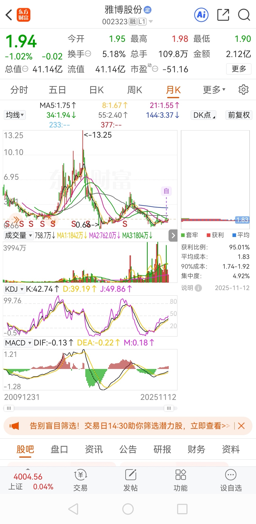 $雅博股份(SZ002323)$ 筹码单峰密集度4.9,筹码分布获利比例89%。
