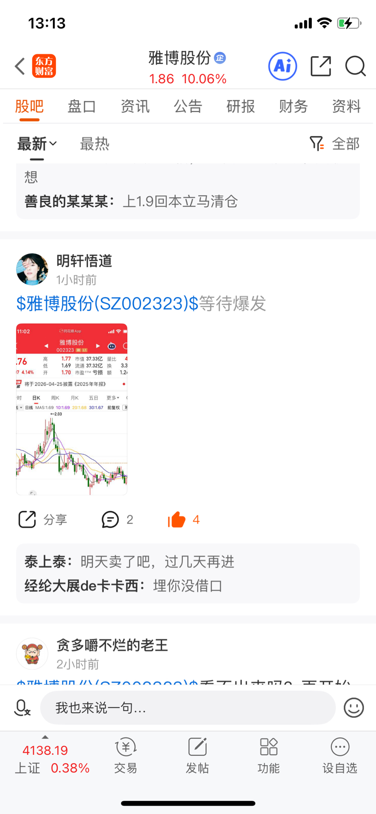 温馨提示: 1.根据《证券法》规定,禁止编造、传播虚假信息或者误导性信息,扰乱证券市场;2.用户在本社区发表的所有资料、言论等仅代表个人观点,与本网站立场无关,不对您构成任何投资建议。用户应基于自己的独立判断,自行决定证券投资并承担相应风险。《东方财富社区管理规定》