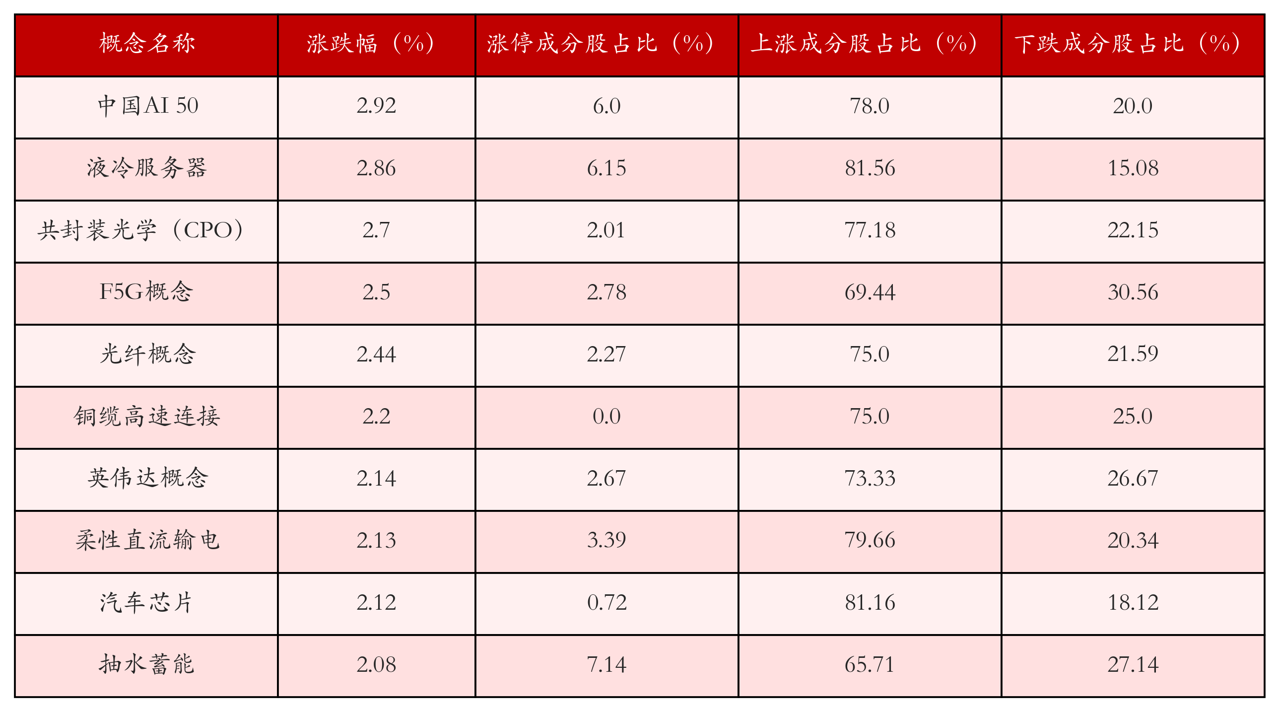 根据A股概念涨跌幅与所对应的股票池综合分析,涨幅靠前的三个概念板块分别为:中国AI 50、液冷服务器与共封装光学(CPO)。排名前10位的概念板块相关数据见下表: