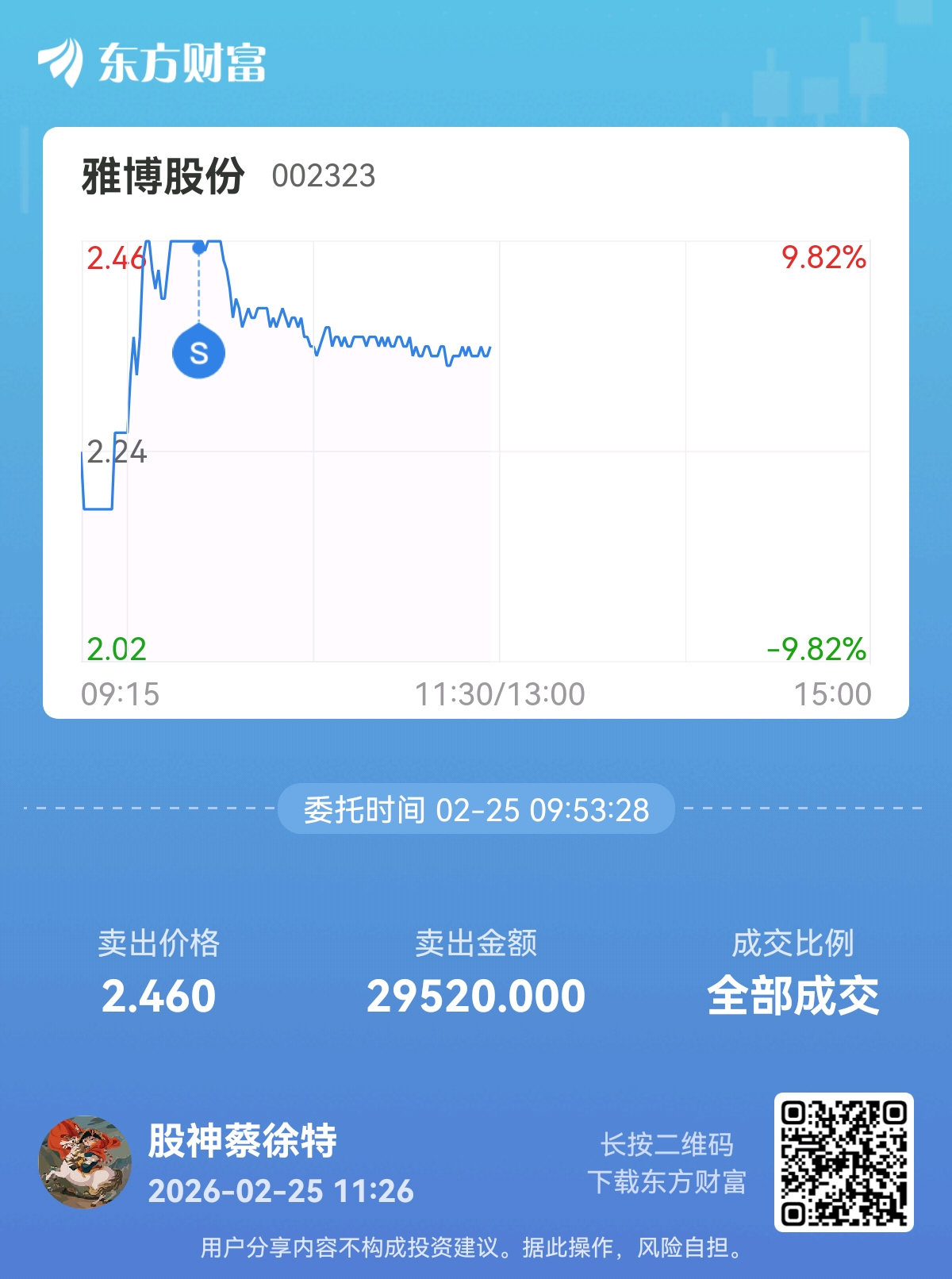 温馨提示: 1.根据《证券法》规定,禁止编造、传播虚假信息或者误导性信息,扰乱证券市场;2.用户在本社区发表的所有资料、言论等仅代表个人观点,与本网站立场无关,不对您构成任何投资建议。用户应基于自己的独立判断,自行决定证券投资并承担相应风险。《东方财富社区管理规定》
