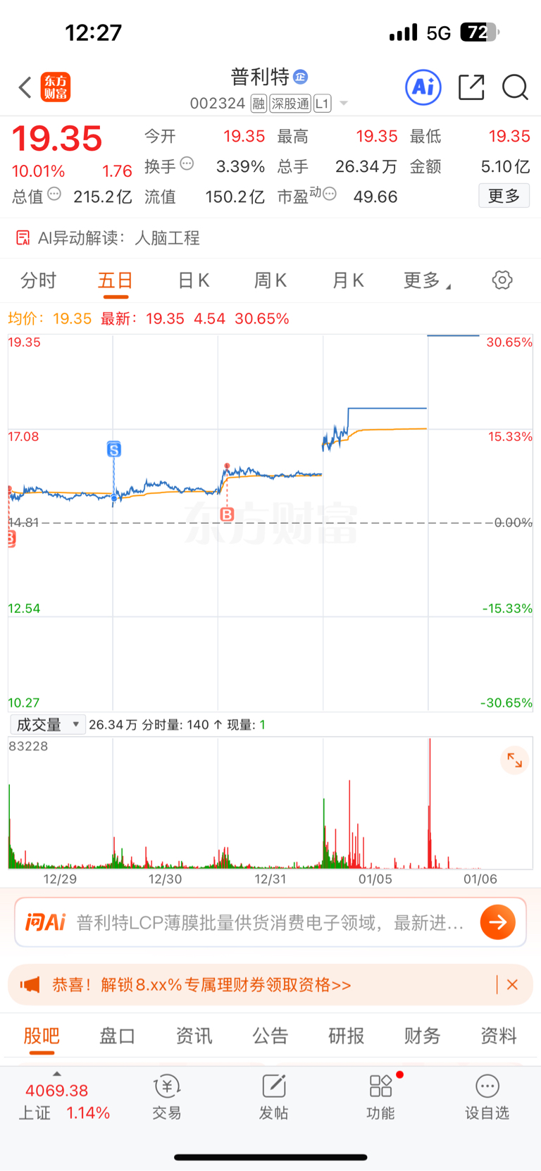 $普利特(SZ002324)$ 身为小散,总算蒙对了一次风口,今天奖励自己吃肉