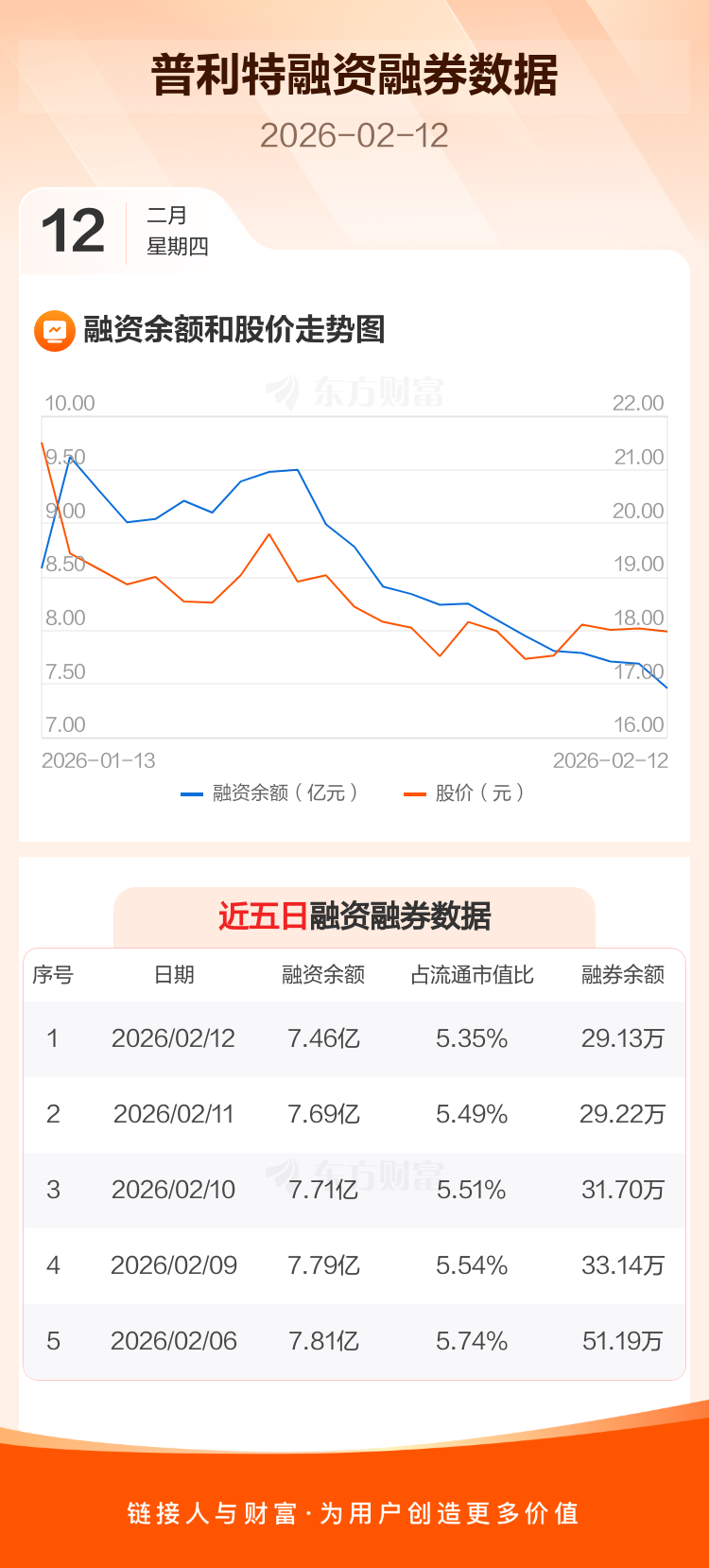 交易所最新数据显示,普利特于2026年2月12日获融资买入2610.22万元,融资偿还4883.37万元,当日融资净偿还2273.15万元。目前,该股融资余额7.46亿,占流通市值比例为5.35%。