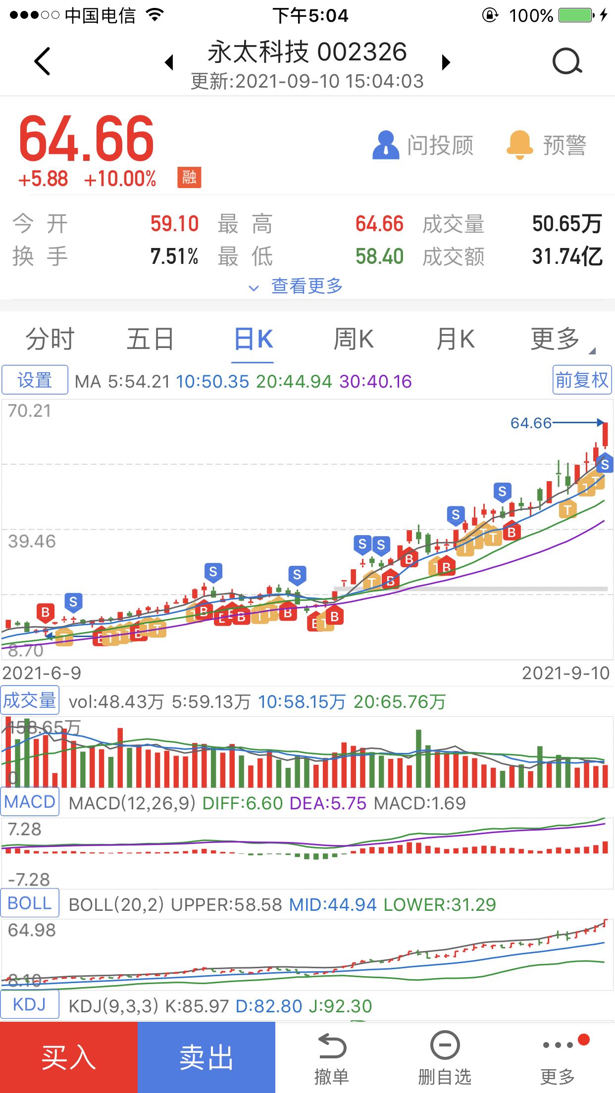 第一次发帖,记录我的第一只翻倍票。上周我选择了落袋为安,可能我做错了,毕竟一直缩量上涨,我也担心是否会减持。但对于永太这只股长线而言我不看空也不看多。不看空的原因是这个公司做了几十年的化工能成为宁德供应商就是实力,对于新能源的发展肯定还是有大机会。不看多的原因是从15块到现在,涨幅巨大,全是获利盘,而且它和最近板块的震荡已经超出了我的承受,加上20这波上来也没有出现大级别回调,个人认为大牛股也不会一口气拉到顶。如果狼真的来了砸下去可能就拉不上来,那估计会有二三十个点的回调。永太一路上来人气一直很低,现在所有利好消息已经成明面了,一个涨停人气暴增。加上大盘已经接触到压力,但凡出现一些大级别震荡,可能会导致永太获利盘践踏涌出。所以临近大节假日建议还是小心点吧。