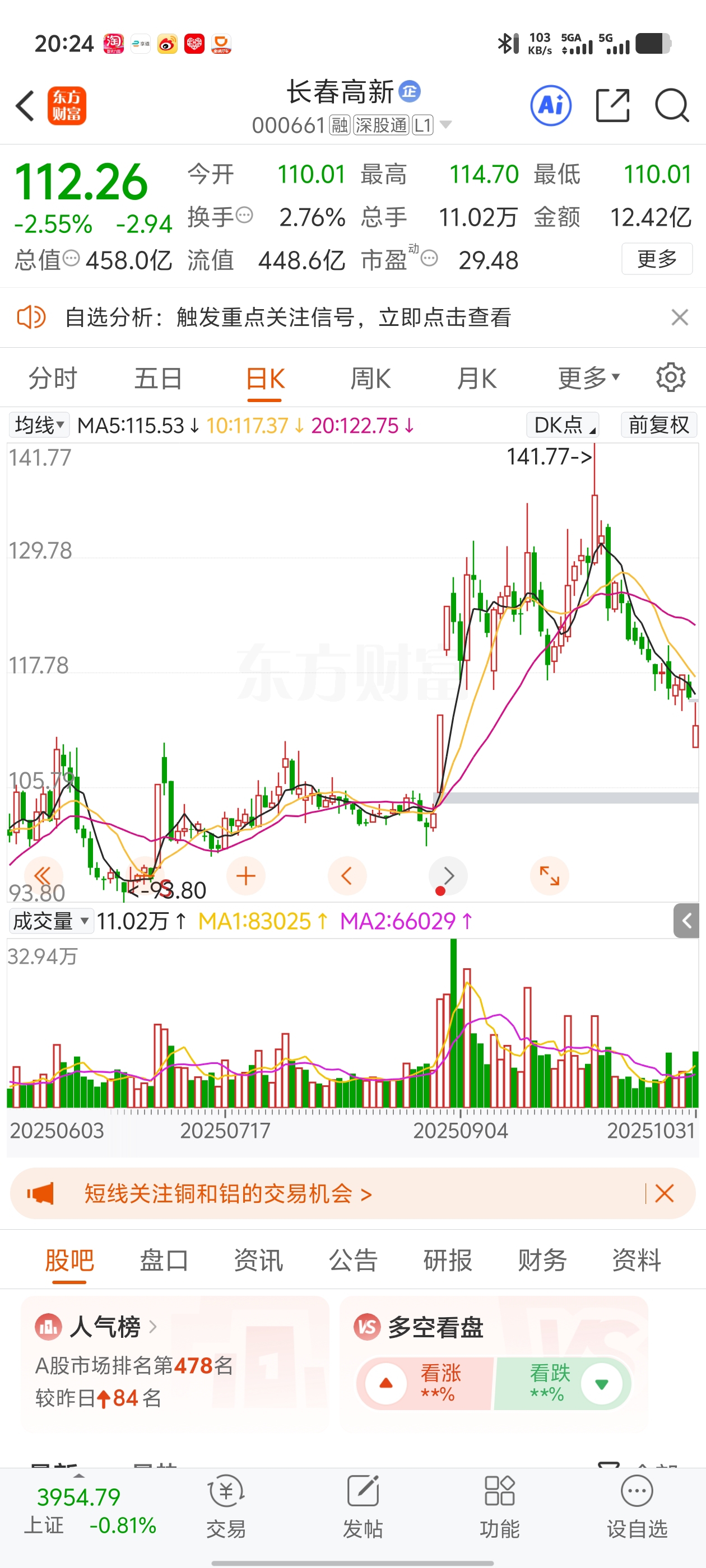 $永太科技(SZ002326)$ 今天忙了一天,现在才有空,早上说的帮大家拉个板也兑现了,营业部2个小目标砸下去了,无奈老庄要继续洗,只能跟着一起T 下周会洗掉一部分人,刚哥这里就不方便透露之后的走势了,被人举报了,顺便看了下这里的一个老登票 @正牌奥利给 这个就是卖了永太去追的长春高新,挺可怜的,大家引以为戒吧