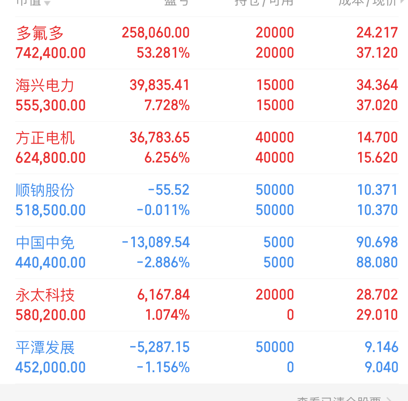 兄弟们 上午好,今天反包行情,昨天跌的基本上都回来了,$顺钠股份(SZ000533)$ 连跌两天吃面,今天一个反包基本回本,我就说核聚变主方向哪里那么容易走弱?$多氟多(SZ002407)$ 氢化工板块持续大涨,多氟多作为龙头今天又吃上了,应该有机会上板。早盘加注氢化工$永太科技(SZ002326)$ 目前反应平平,冲高震荡。下午再看看。