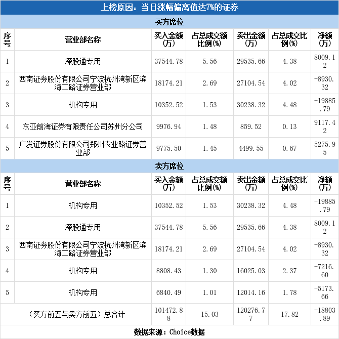 今日龙虎榜单上出现了深股通的身影,占据了买一、卖二的位置,净买入8009.12万元,占当日成交总额的1.19%。
