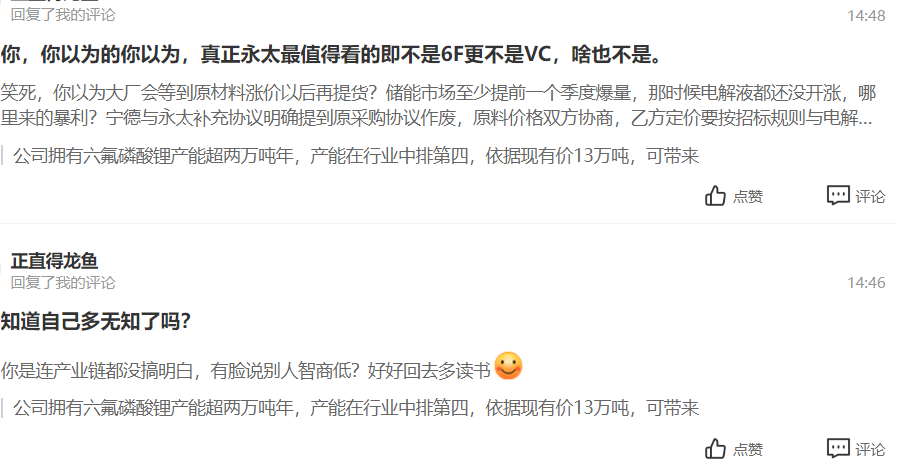 图上这个韭菜就是如此,教都教不明白的韭菜,今天看到永太股价上涨美滋滋地跑过来宣战,他的心理是:股价涨了,你这个唱空的亏货就是个loser。