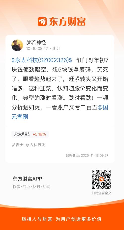 $永太科技(SZ002326)$ 缸门哥年初7块钱使劲唱空,想5块钱拿筹码,笑死了,眼看趋势起来了,赶紧转头又开始唱多,这种韭菜,认知随股价变化而变化。典型的涨时看涨。跌时看跌!一顿分析猛如虎,一看账户又亏二百五@国元孝刚