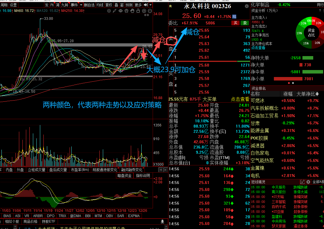 永太短期可能走势以及应对策略:1.若先过27.06的前高,则对加仓部分做减仓,减
