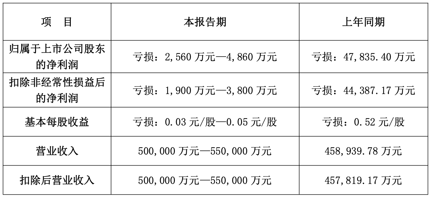公司预计2025年实现营业收入50亿元至55亿元;归母净利润亏损2560万元至4860万元,上年同期亏损4.78亿元;扣非净利润亏损1900万元至3800万元,同比减亏约4.06亿元–4.25亿元,亏损幅度收窄91.44%–95.72%。
