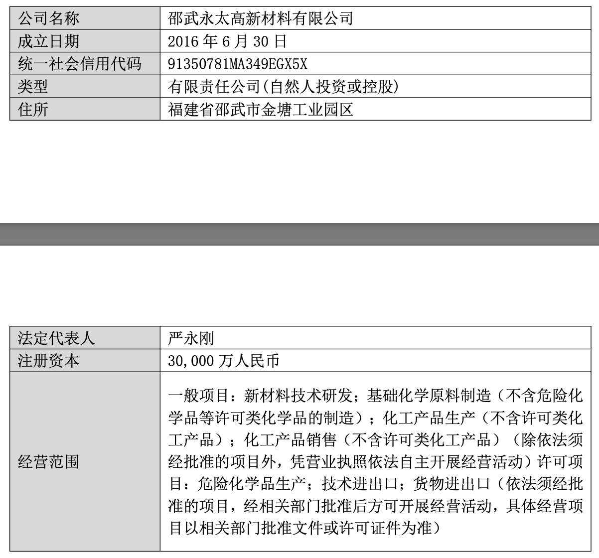 资料显示,永太高新成立于2016年6月30日,法定代表人为严永刚,注册资本为3亿元,公司经营范围包括新材料技术研发、基础化学原料制造(不含危险化学品等许可类化学品的制造)、化工产品生产(不含许可类化工产品)等。