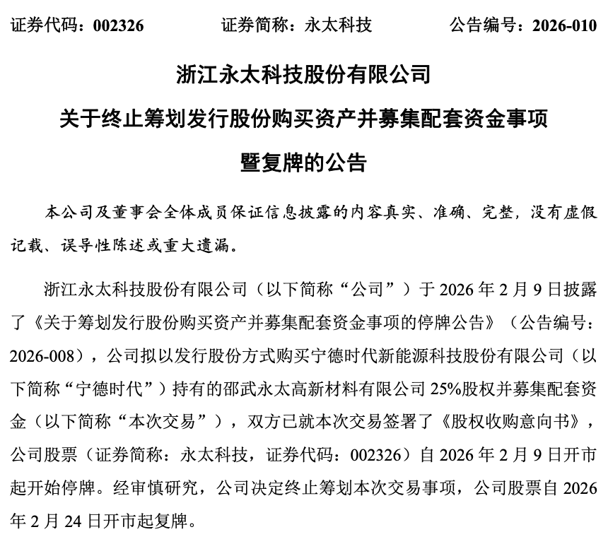 2月13日,永太科技(002326)公告,公司原拟以发行股份方式购买宁德时代持有的邵武永太高新材料有限公司25%股权并募集配套资金。鉴于后续各相关方未能就交易方案达成一致意见,综合考虑公司实际情况及外部因素,经审慎评估并与相关方充分沟通,公司决定终止筹划本次交易事项,本次终止不会对公司的生产经营造成重大不利影响。公司股票自2月24日开市起复牌。