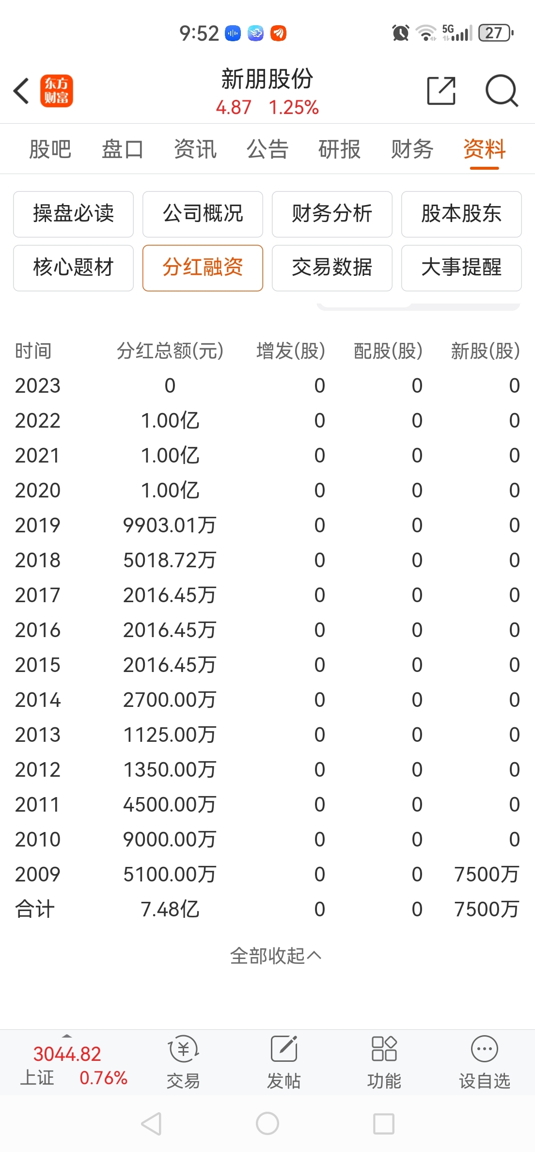 09年至今每年坚持现金分红,累计每股分红1.502元每股累计送股1.2股,