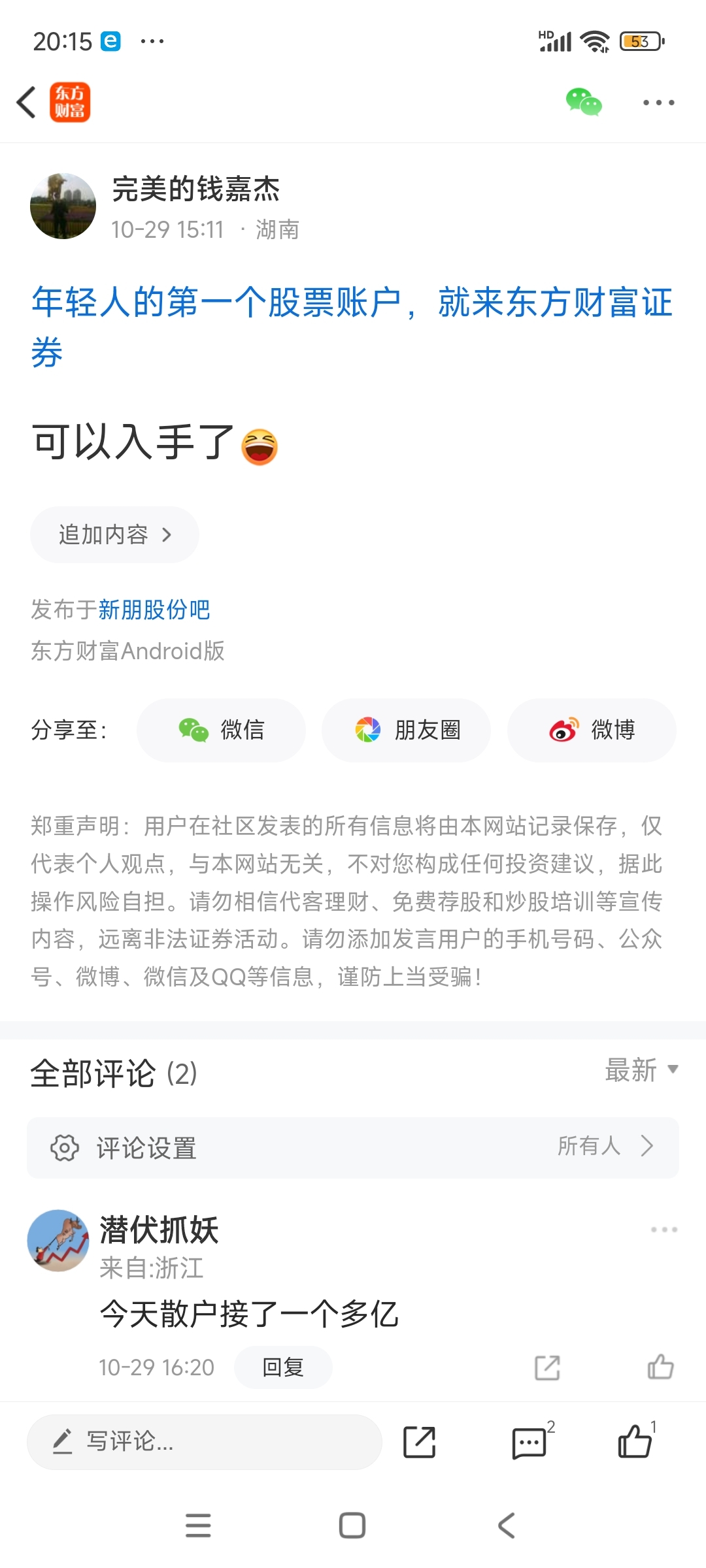 温馨提示: 1.根据《证券法》规定,禁止编造、传播虚假信息或者误导性信息,扰乱证券市场;2.用户在本社区发表的所有资料、言论等仅代表个人观点,与本网站立场无关,不对您构成任何投资建议。用户应基于自己的独立判断,自行决定证券投资并承担相应风险。《东方财富社区管理规定》