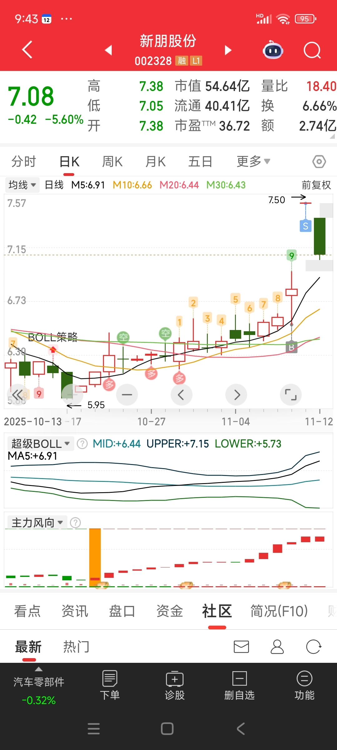 $新朋股份(SZ002328)$ 昨天板上换手率有点高,所以就卖了