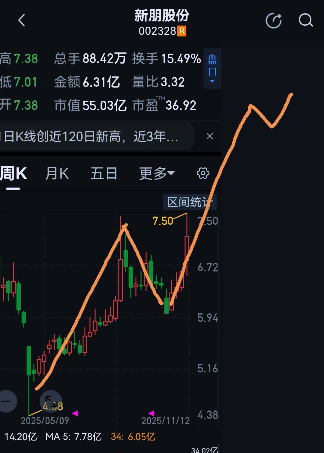 $新朋股份(SZ002328)$ 耐得住寂寞的可以留下来验证是否成立:3浪11左右、5浪13.5左右