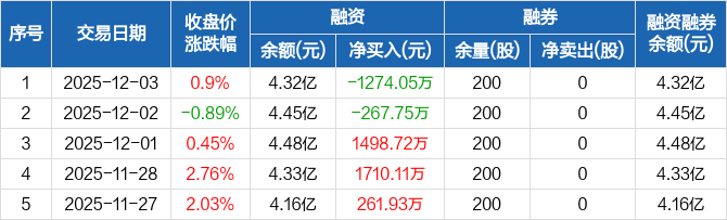 新朋股份:融资净偿还1274.05万元,融资余额4.32亿元(12-03)