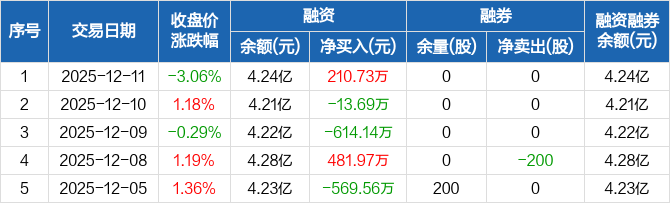 新朋股份:融资净买入210.73万元,融资余额4.24亿元(12-11)