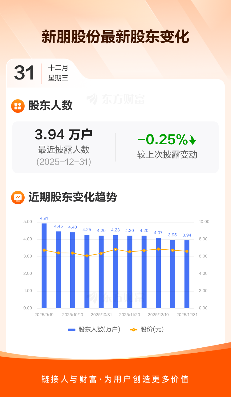 新朋股份最新披露数据显示,截至12月31日公司股东户数为3.94万户,较上期(2025年12月20日)减少100户,降幅为0.25%。户均持有流通股数量为1.45万股,与上期基本持平,户均持股金额由上期的9.71万元减少至9.58万元。