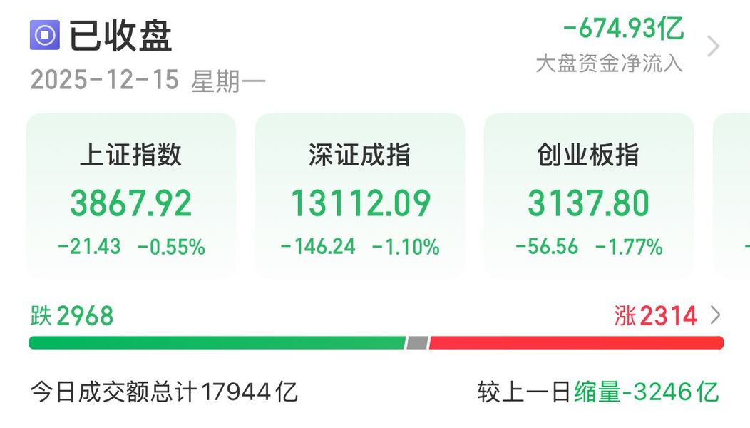 12月15日,A股三大指数集体调整。截至收盘,上证指数跌0.55%,深证成指跌1.10%,创业板指跌1.77%。全市场成交1.79万亿元,较上个交易日缩量3246亿元。