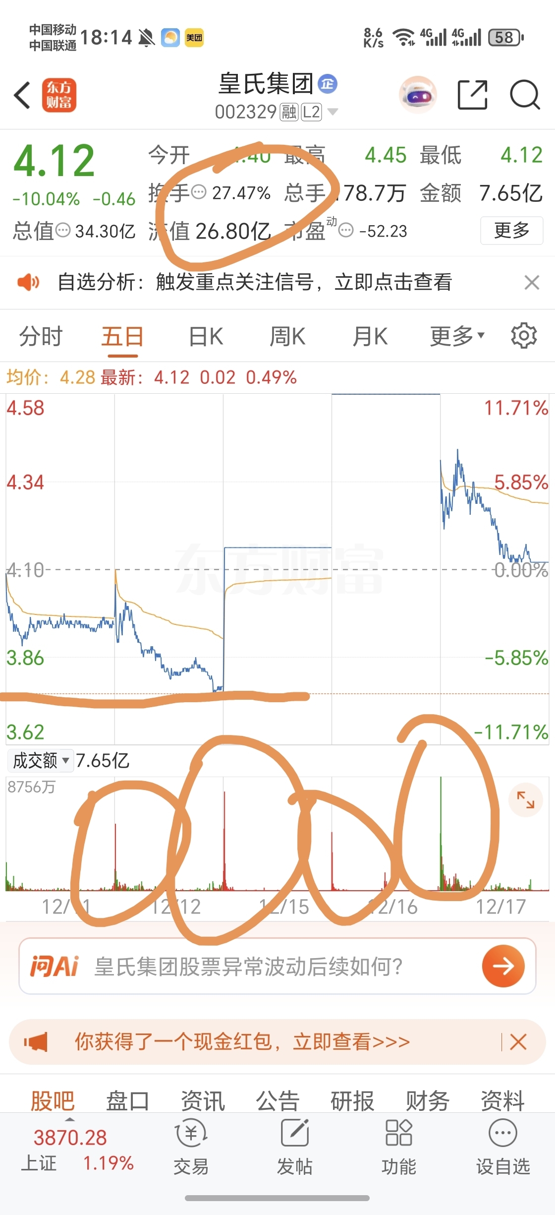$皇氏集团(SZ002329)$ 今天抄底的明天会割肉,今天换手率太高,3.76以上卖出主力都是赚钱的,看样子还会跌好多天