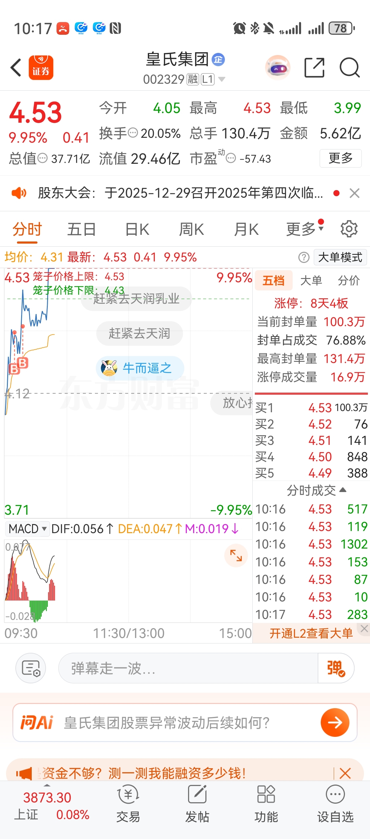$皇氏集团(SZ002329)$ 就知道你今天会涨停。