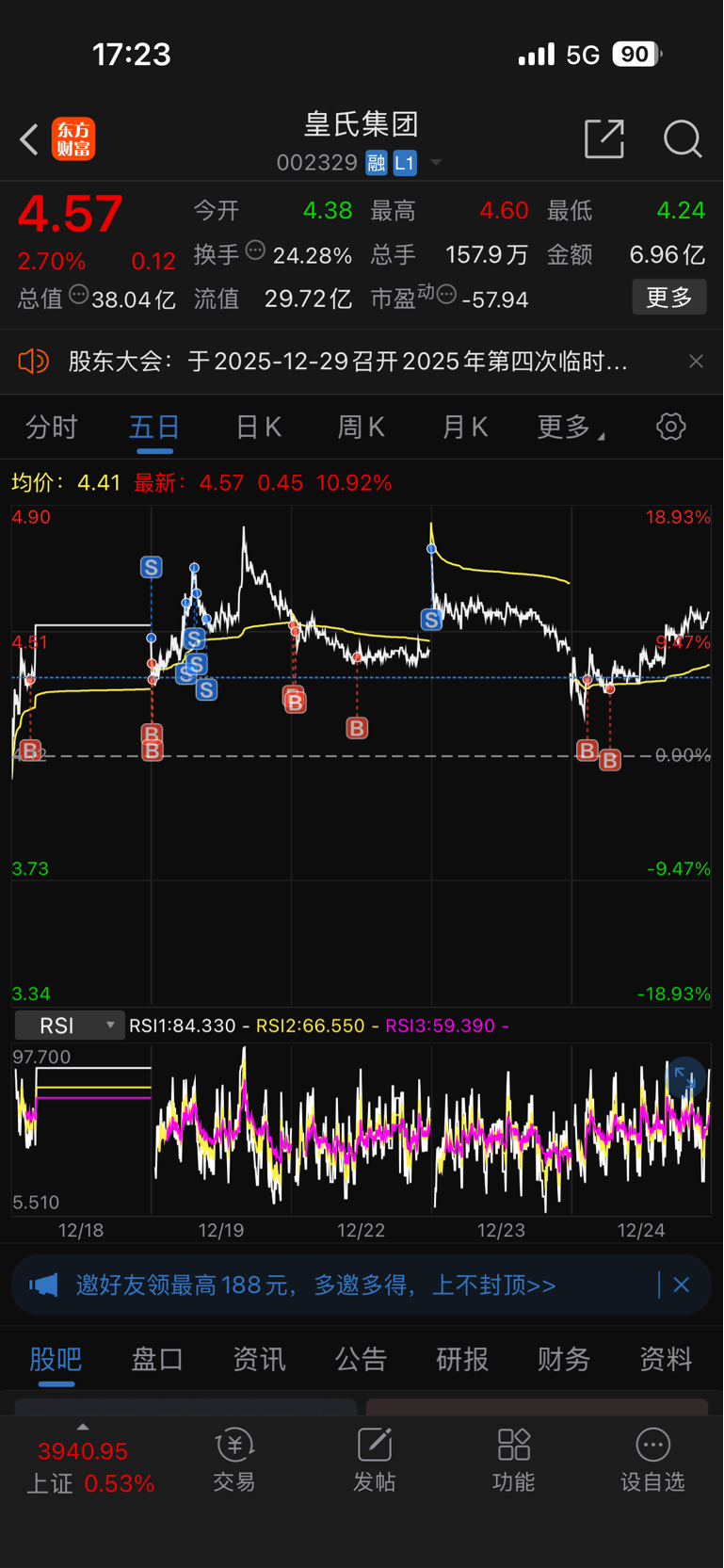 $皇氏集团(SZ002329)$ 我愿称之为好股,今天失误就是那会挂低了,砸到4.26,我赶紧挂的4.2没成交,一犹豫拉起来了,赶紧追进来,散户们能做的就是低买高卖
