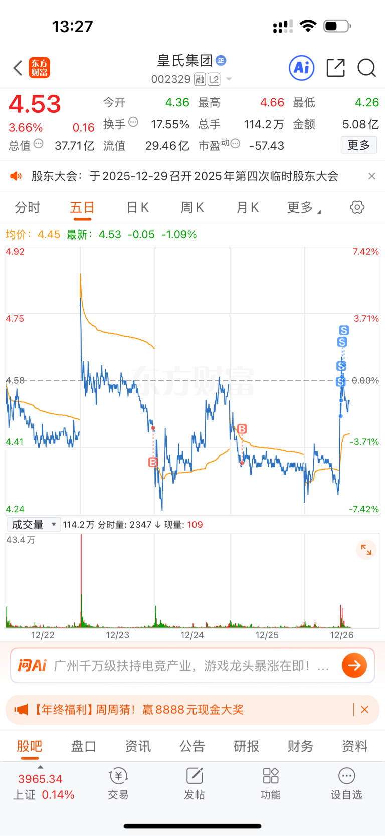 $皇氏集团(SZ002329)$ 没板的可能,撤退了。占用我4天资金,挣6个点