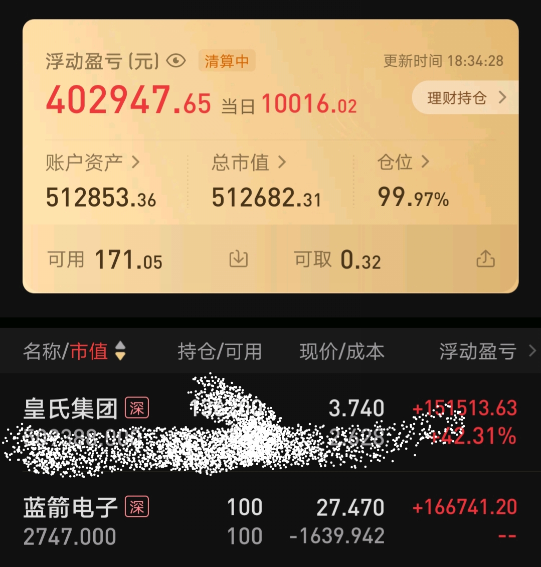 $皇氏集团(SZ002329)$ 2024年7月拿到现在,都没说过皇氏集团半句不好的话,有许多人赚的钱比我多许多,也有人不赚钱还亏的吗?而我刚刚好比银行利息多一点点,长线的人永远不会亏,买皇氏集团这种慢牛妖股,就要和十大股东一样,赚点小钱是没问题的,祝大家新年快乐!