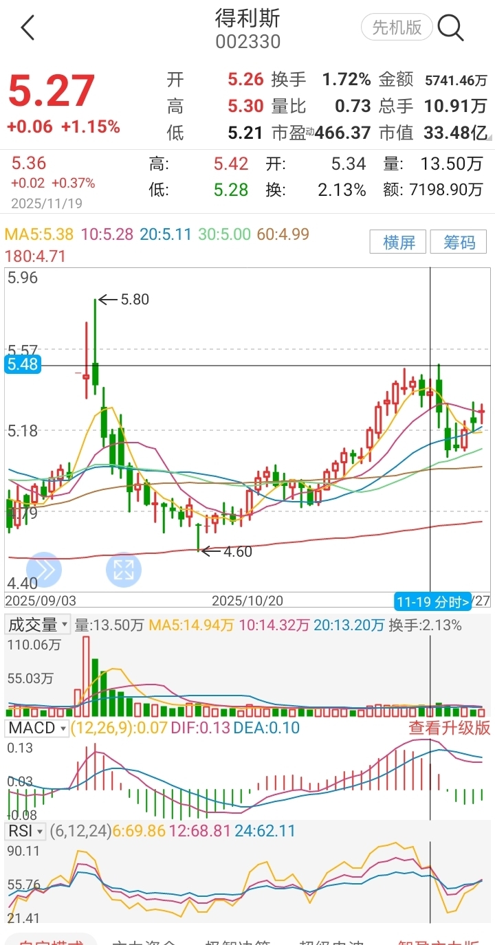 $得利斯(SZ002330)$ 一哥观点:两个字太弱,太墨迹,中线看两月前的前高5.8元,期间周期会拉长,耽误时间,一哥操作,再持股一天,明日所有急拉减半仓,因为前高有大量抛压5.5元前高,一鼓作气是不可能的。若明日直接回调,则看下跌力度,小阴持股,中阴三个点清仓换股。跟上升趋势的龙头。