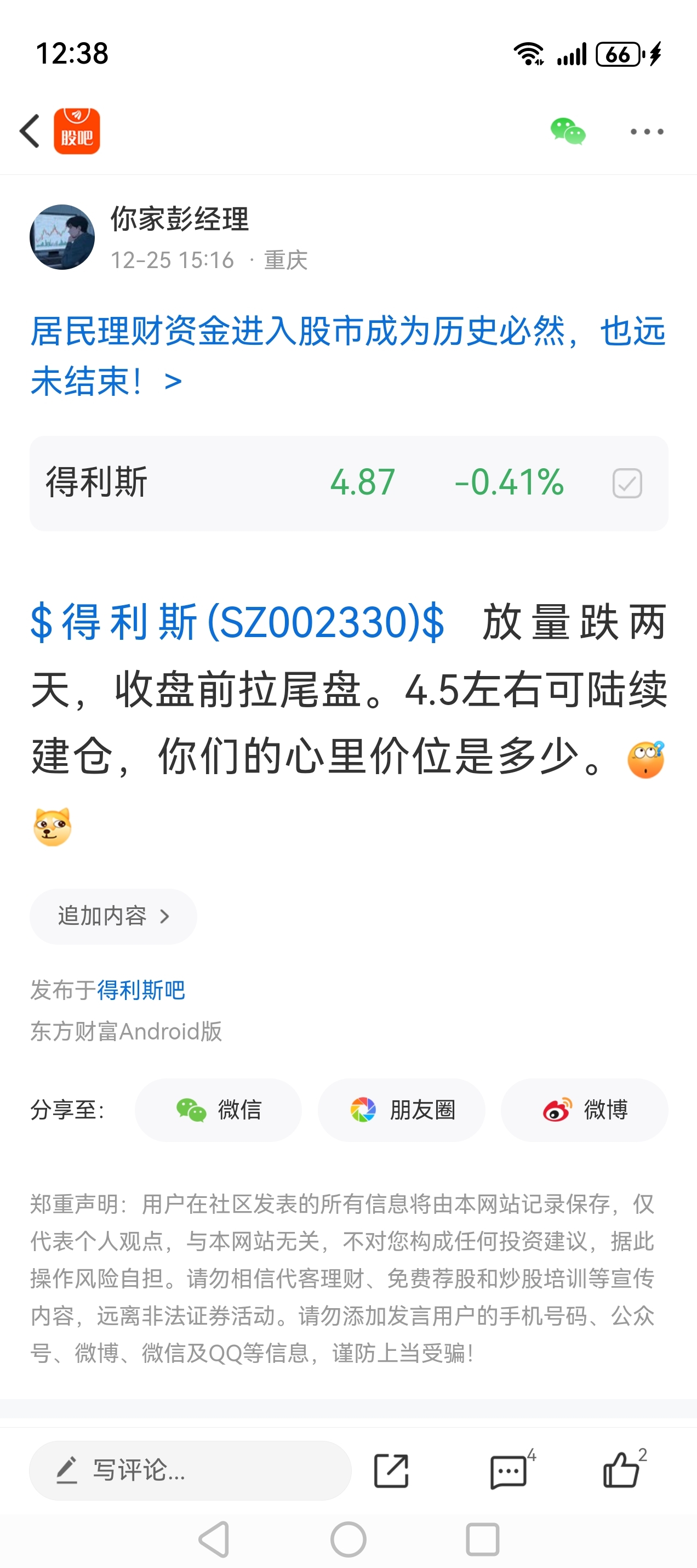 温馨提示: 1.根据《证券法》规定,禁止编造、传播虚假信息或者误导性信息,扰乱证券市场;2.用户在本社区发表的所有资料、言论等仅代表个人观点,与本网站立场无关,不对您构成任何投资建议。用户应基于自己的独立判断,自行决定证券投资并承担相应风险。《东方财富社区管理规定》