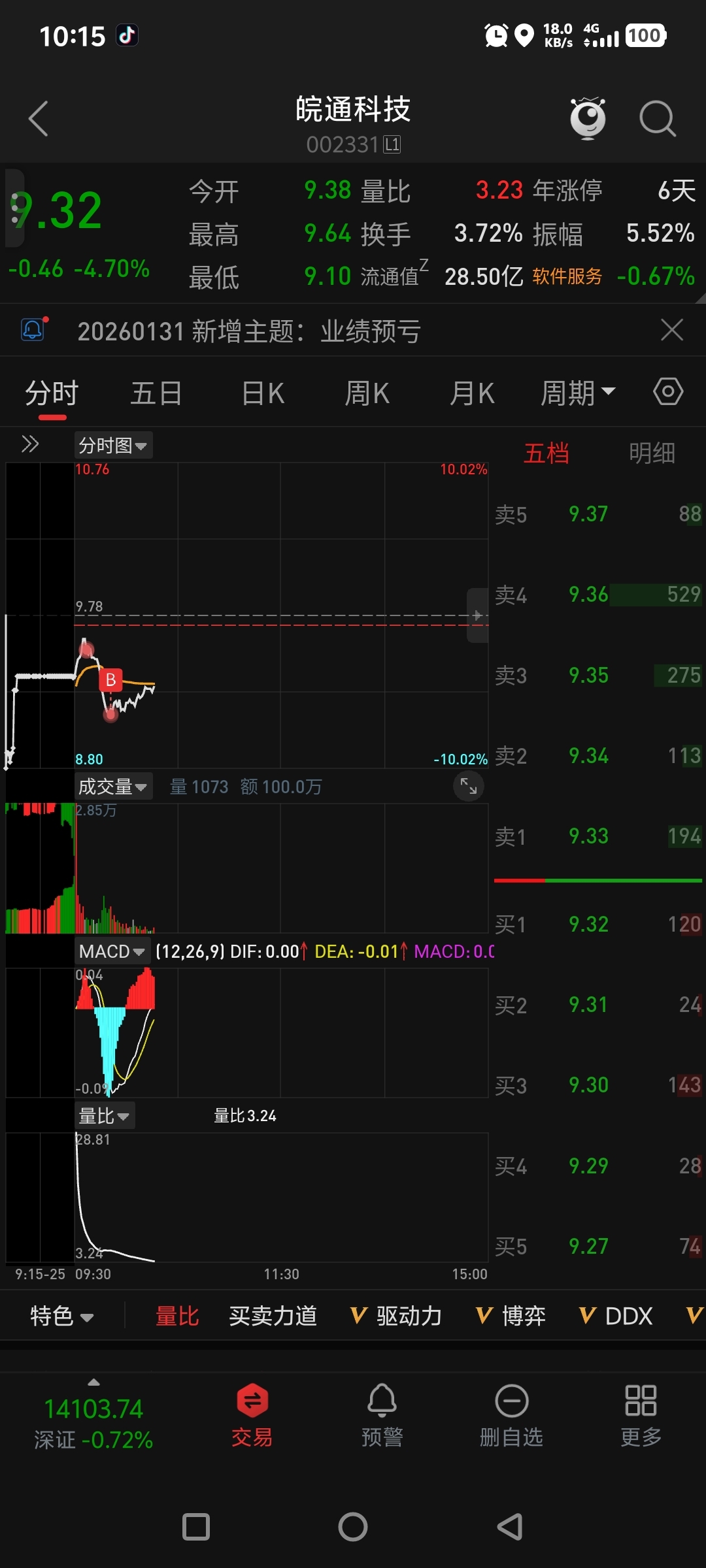 $皖通科技(SZ002331)$ 上周预计9.3-9.4加仓,没想到还有9.2的筹码
