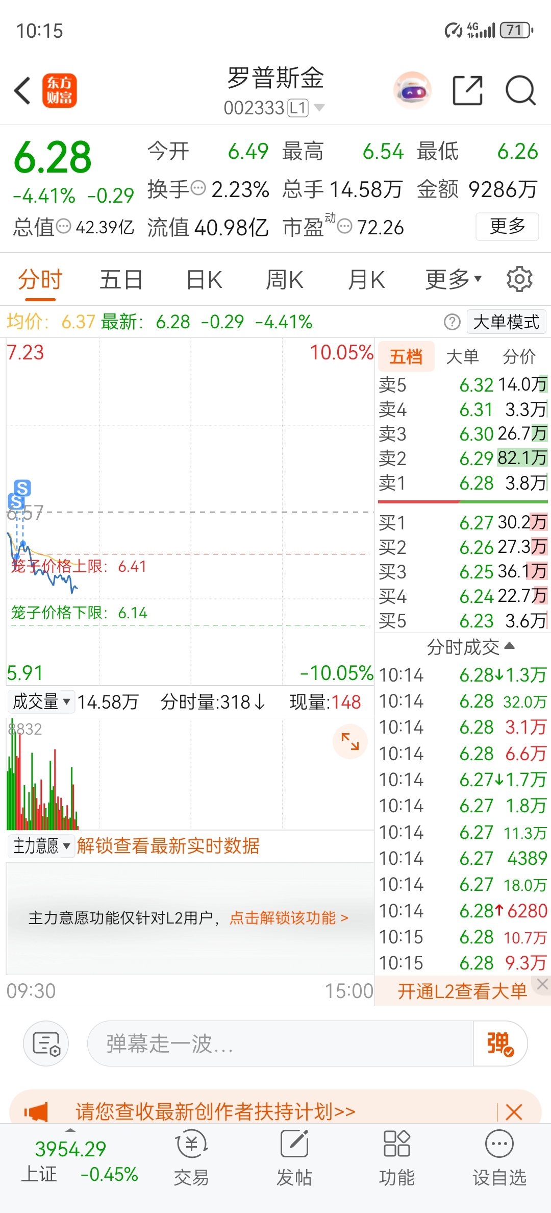 $罗普斯金(SZ002333)$ 昨天进的,昨天尾盘看他故意拉上5日均线就知道今天没有希望,竞价又不及预期,开盘就跑了