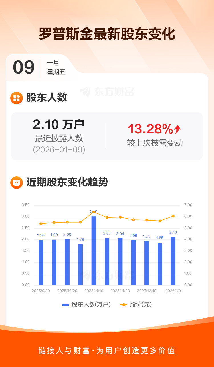 罗普斯金:截至1月9日最新股东户数2.10万户,较上期增加13.28%