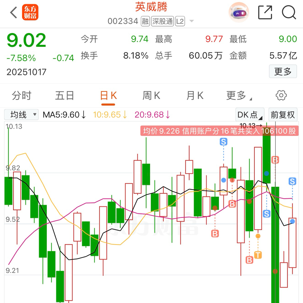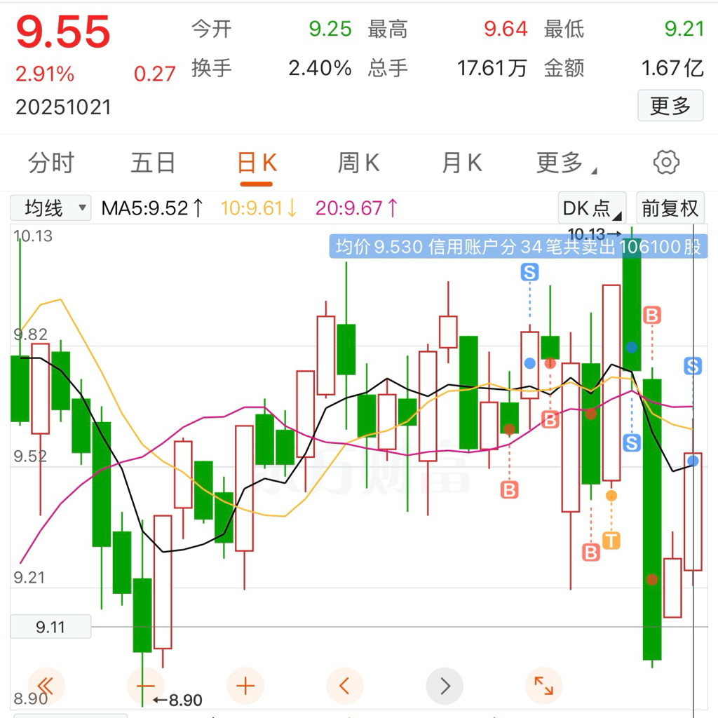 上周五一路跌一路买,均价9.22买了10w股。今天分两次卖了,均价9.53。赚一